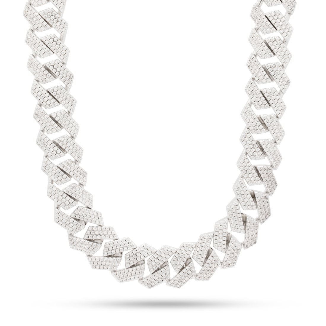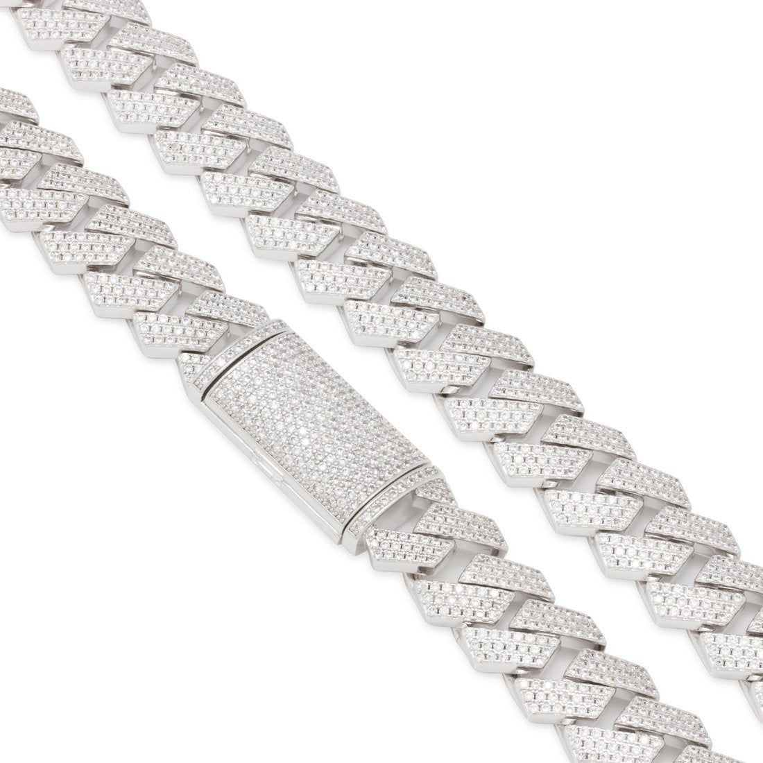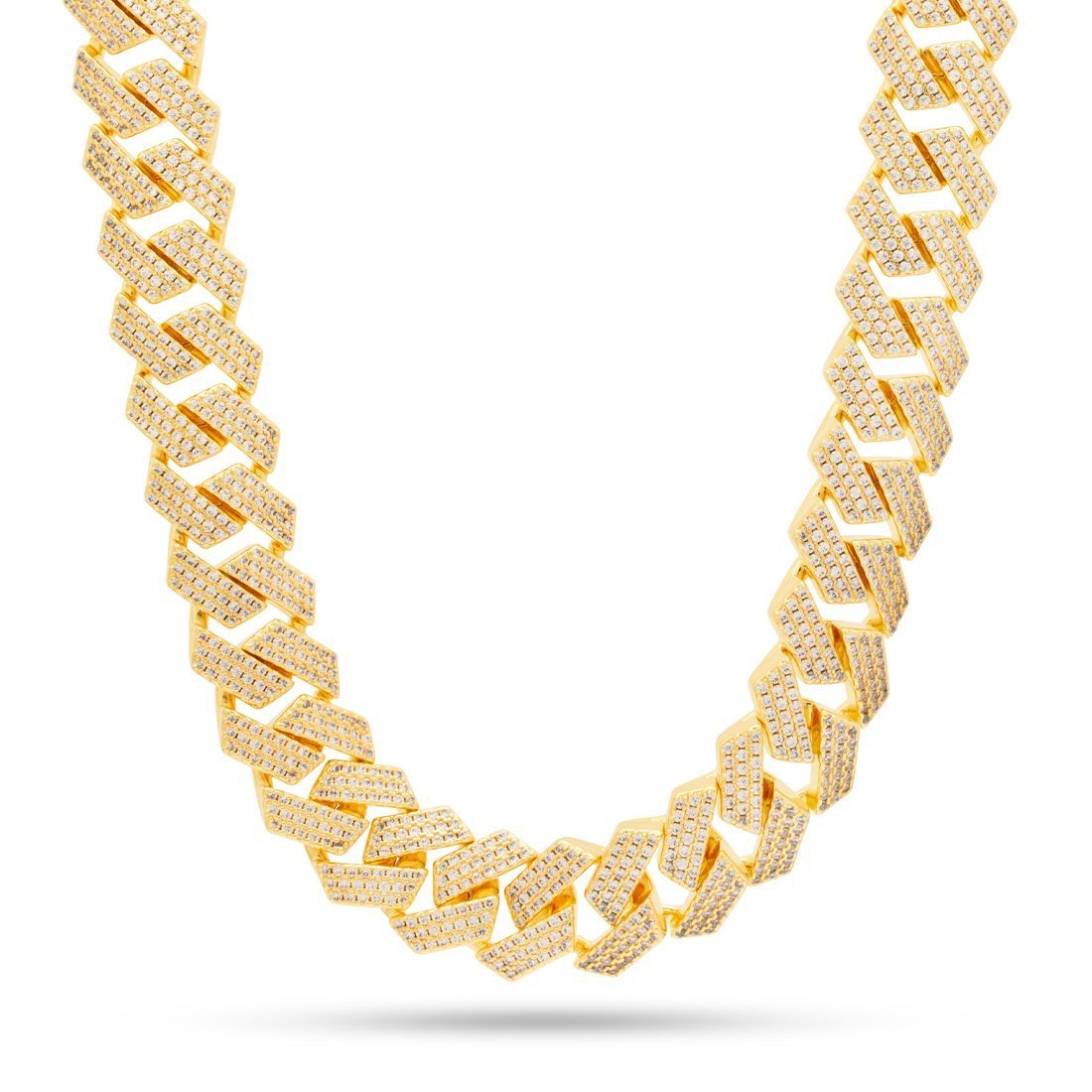 The new 18mm Diamond Cut Miami Cuban Chain features a straight, sharp link design. This chain and custom lock box is iced with more than 1,800 VVS Diamond Simulate stones. The chain is available in 14K Gold plating and white gold plating in various lengths.