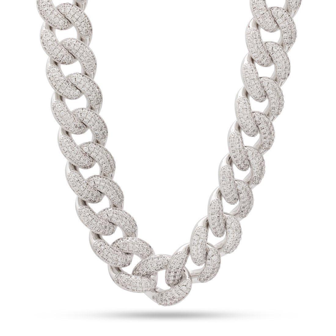 The classic King Ice Miami Cuban Chain is back. With endless CZ stones, the chain has a radiant look to it. Available in 14K Gold plating and white gold plating, the 20mm multi length chain matches perfectly with the bracelet. The chain comes with a custom Greek Key push down clasp for a secure and comfortable wear.