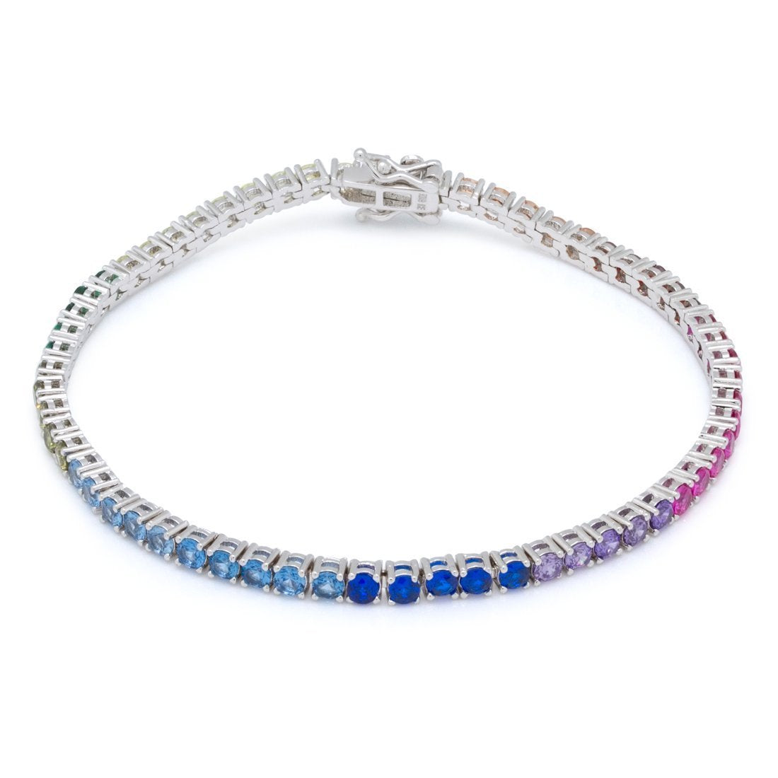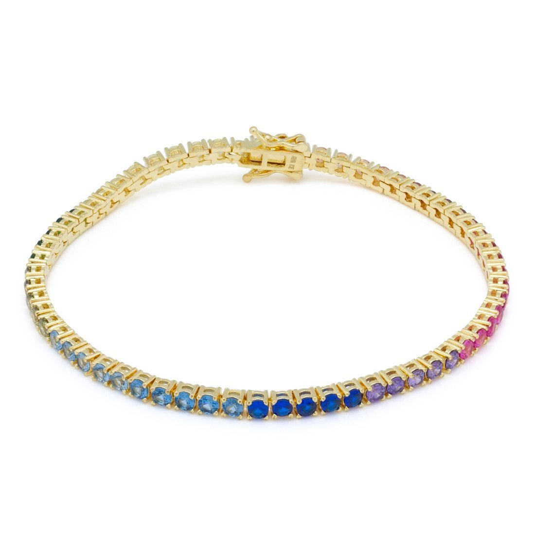 You can now sport the rainbow with King Ice's new 3mm Spectrum Tennis Bracelet. Multicolored VVS Diamond Simulates form the rainbow all around this piece. Each bracelet is available in 14K Gold plated and white gold plated finishes.