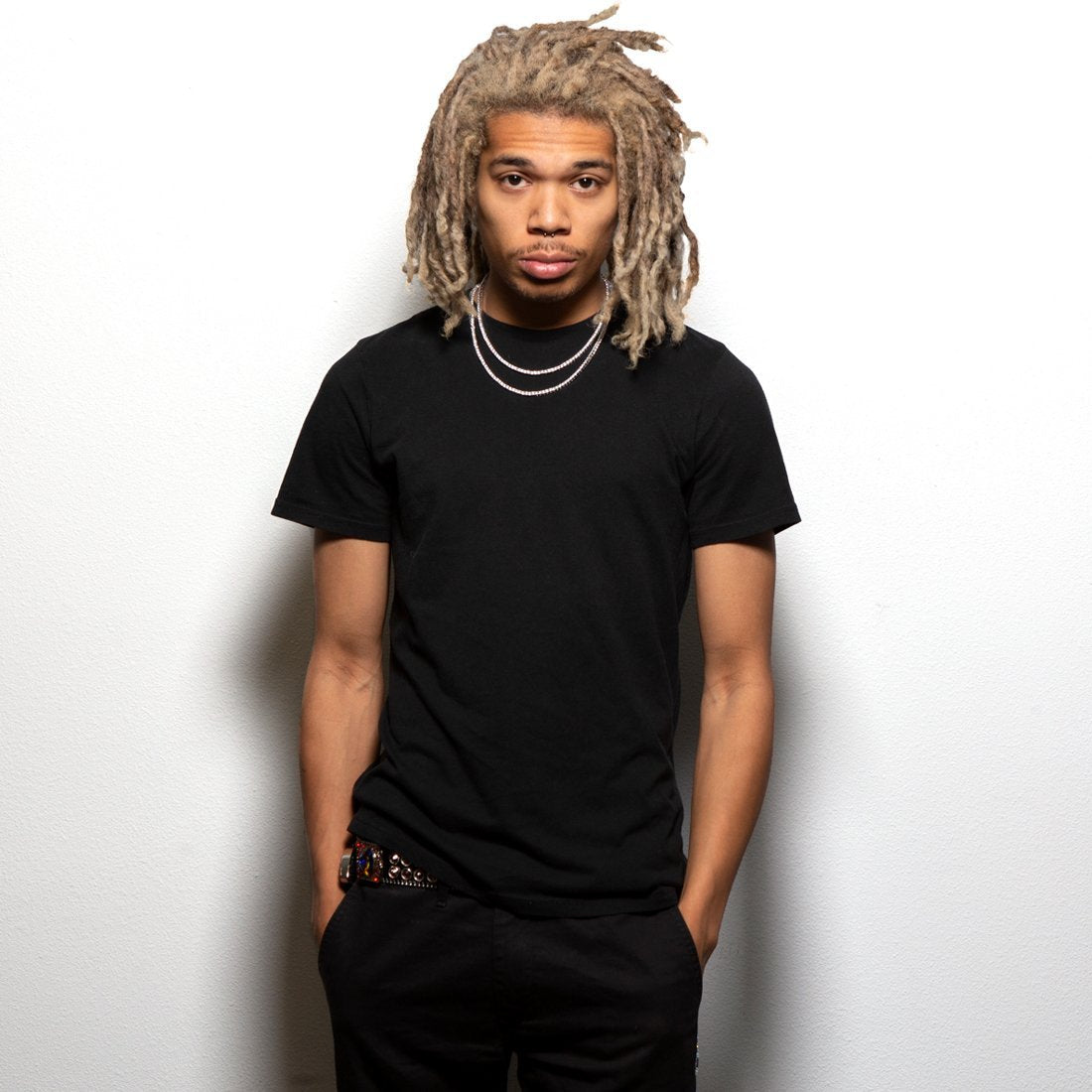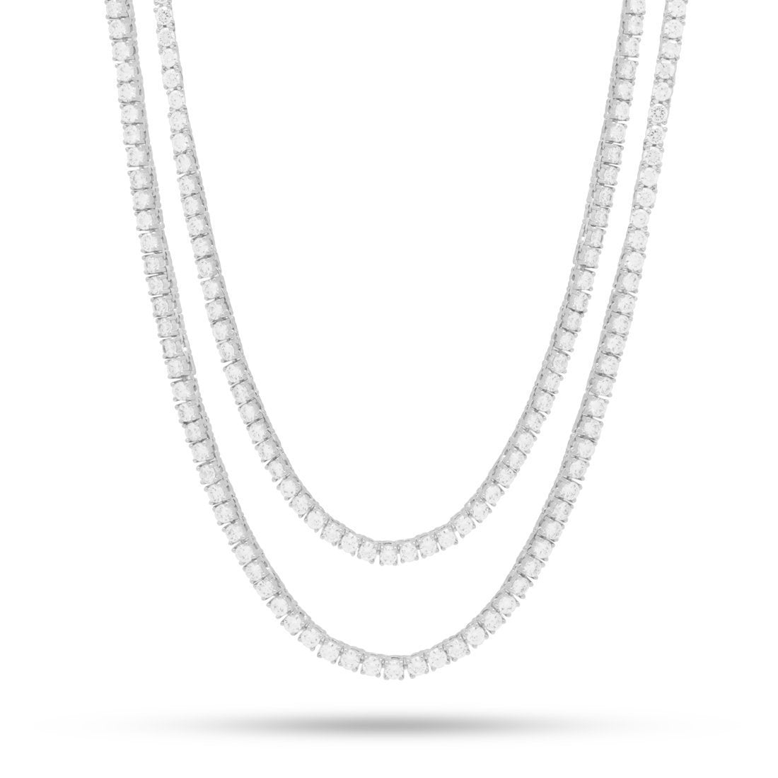 The new King Ice 3mm White Gold Tennis Choker Set pays tribute to the multi use trend rooted by prominent hip hop artists since the late 70s. Each choker is plated with a white gold finish and white gold prongs frame CZ stones. The chokers measure 18" and 20" for a suitable match when worn together.
