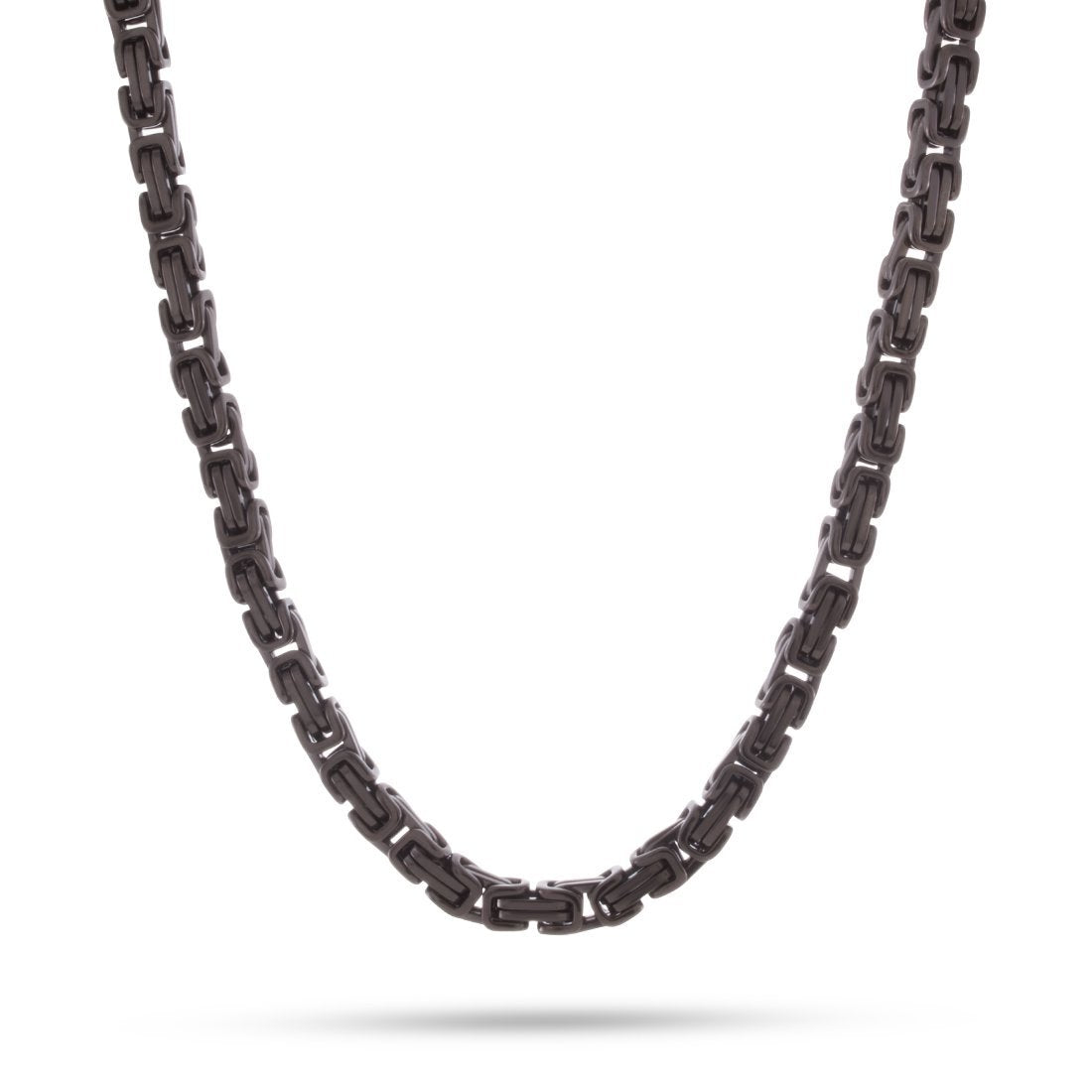 Check out this 5mm men's bike chain designed by King Ice. It features a black rhodium-ionic plating with a high-polish finish and a fold-over clasp. This 5mm chain is available in different lengths. The King Ice logo is engraved on the clasp.
