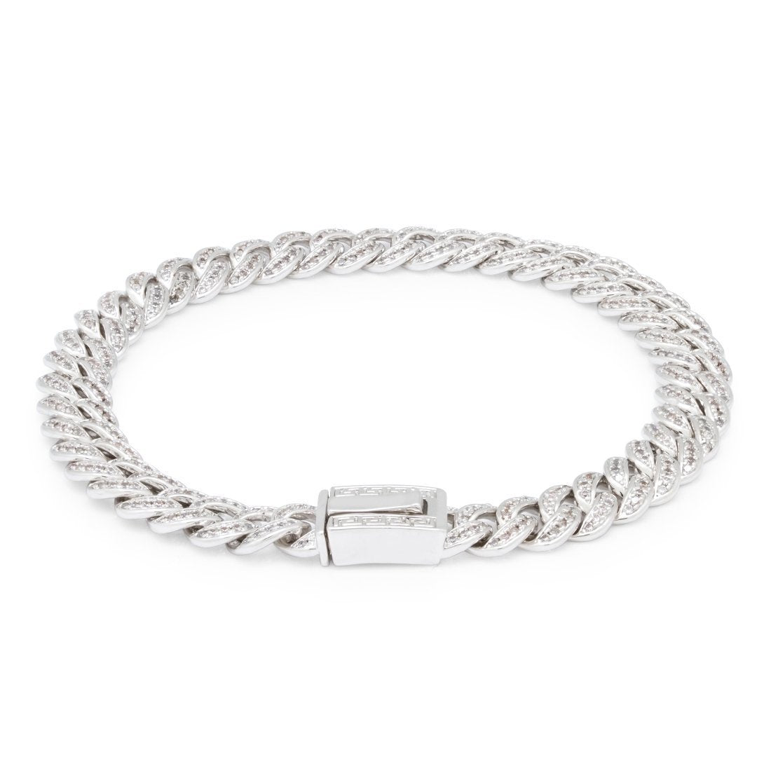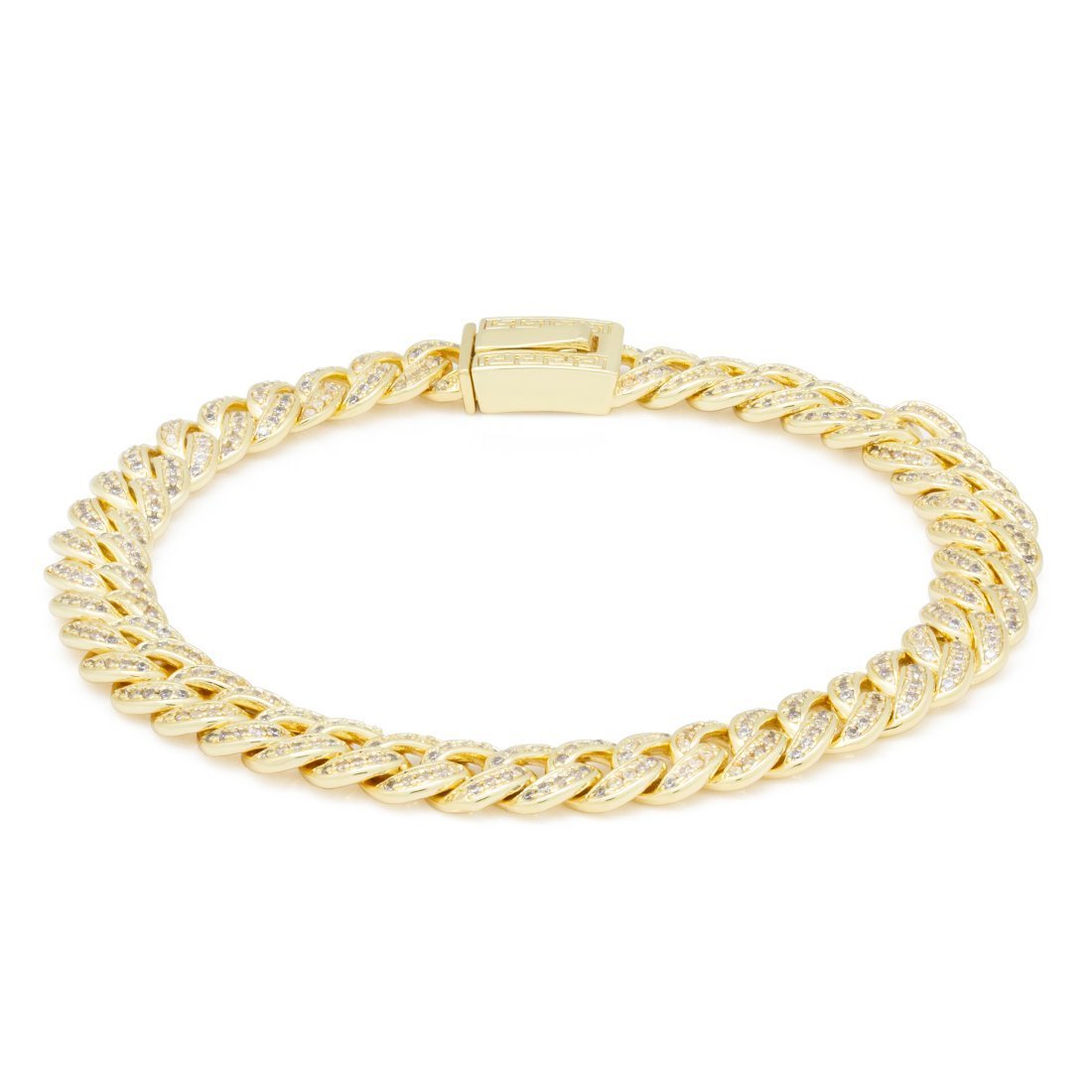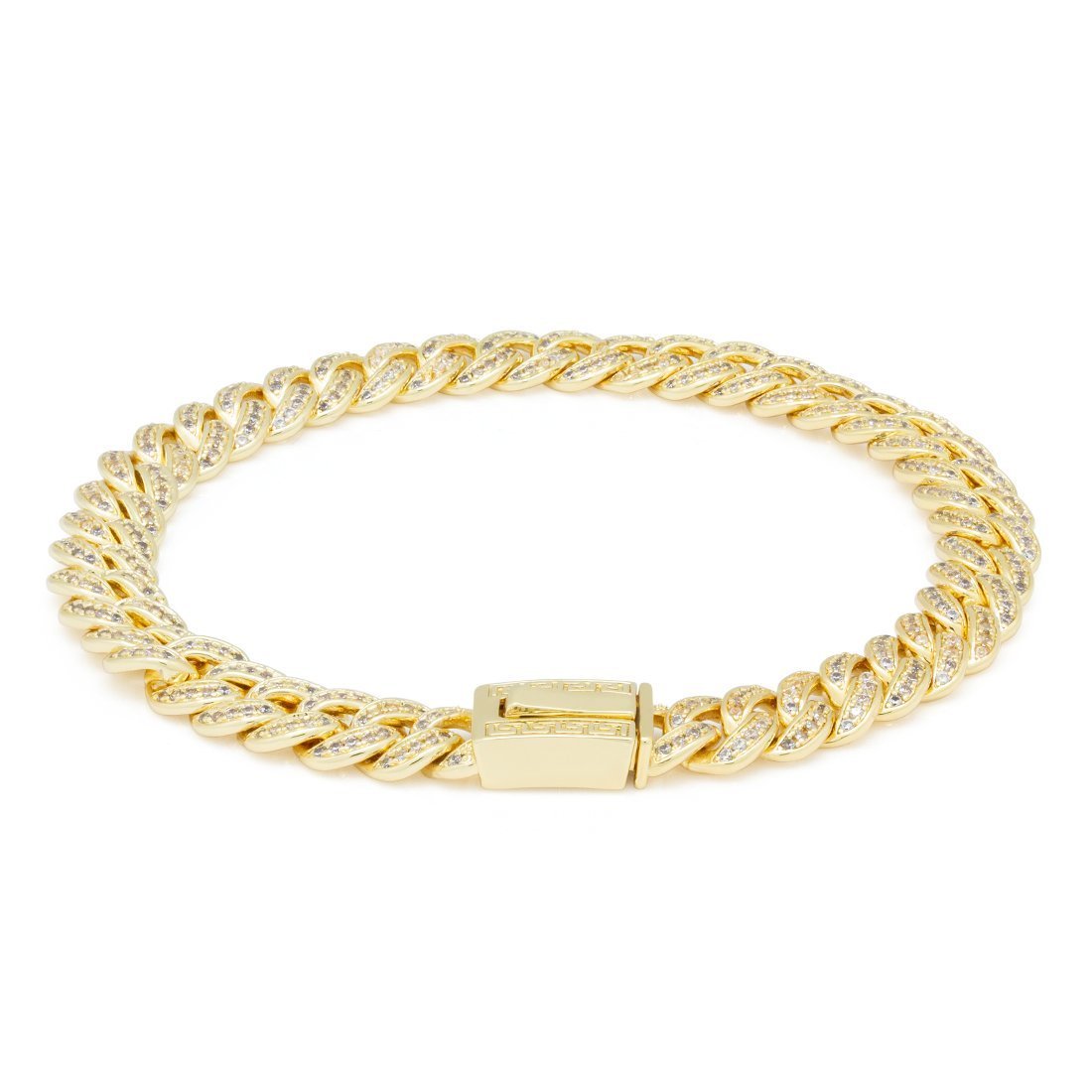 Made to match alongside the 8mm Iced Chain, each bracelet provides the perfect accessory thanks to its eye-catching appearance. Built using handset CZ stones, the 8mm Iced Miami Cuban chain bracelet provides that iconic look in 14K Gold plating and white gold plating. The new and improved Greek Key push down clasp grants a secure, stylish look.