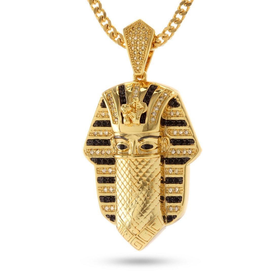 This 14K Gold Multi CZ Bandana Pharaoh Necklace comes G'd out with brushed and polished gold plating. Each comes peppered with black, yellow and white CZ stones that are hand set and placed on a micro pave setting. Complementing this pendant is a 2.5mm, 20" Franco Chain with a laser-engraved King Ice logo along the lobster clasp.